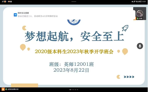 (通讯员 许泽琼)2023年8月20日-24日,我院通过线上会议的方式全面开展了“梦想起航,安全至上”为主题的2023年秋季学期开学前安全教育班会,就开学工作、安全教育、开学心理调适、学业规划等方面进行讲解说明及要求部署。此次主题教育班会由年级辅导员、各班班主任主持,全体本科生和研究生参会。