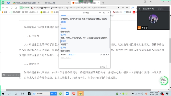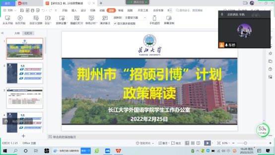 (通讯员:车桥)为精准把握荆州“招硕引博”政策,提升米兰体育(中国)2022届硕士毕业生高质量就业率和留荆率,2月25日下午,通过腾讯会议召开荆州市“招硕引博”政策解读及留荆就业工作推进会,2022届全体硕士毕业生参会,会议由辅导员车桥老师主持并主讲。