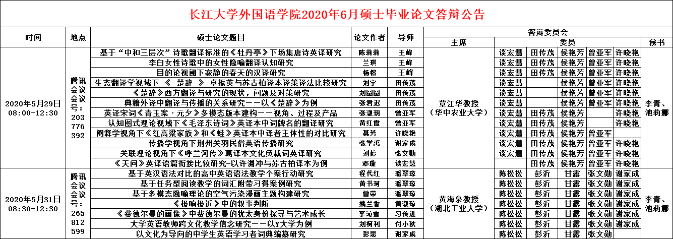 米兰网页版2020年6月硕士毕业论文答辩公告