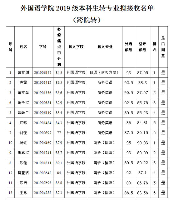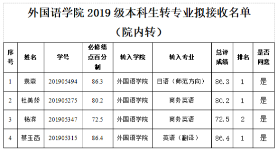 【转专业名单公示】米兰体育(中国)2019级本科生转专业拟接收名单公示