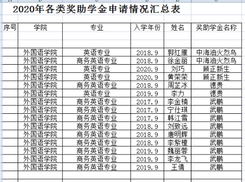 根据学校及中海油火烈鸟助学金、顾正新生助学金、德贵奖学金、武鹏奖学金等相关文件的精神要求,学院认真组织了2020-2021学年中海油火烈鸟助学金、顾正新生助学金、德贵奖学金、武鹏奖学金的评选工作,通过个人申请、学院奖助学金评审委员会评审,经学院党政联席会审批通过,现将我院2020-2021学年中海油火烈鸟助学金、顾正新生助学金、德贵奖学金、武鹏奖学金评选结果公示如下: