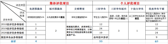 6.优秀学生干部:优秀学生干部指标为各学院除一年级以外本科学生总人数的6%,其中优秀寝室长不低于获奖人数的15%,班级安全员不低于获奖人数的10%;校级学生组织优秀学生干部指标单列,但不得与学院重复提交。