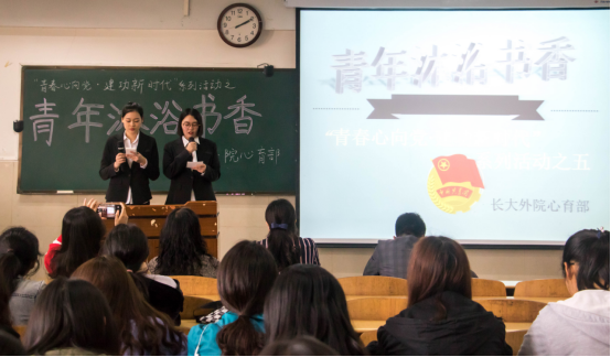 (摄/曾晓静 文/覃航)阅读经典文化,激发读书兴趣,传承五四精神,师生共沐书香。5月9日下午2点,我院于12教402举行了“青春心向党,建功新时代”系列活动之沐浴书香读书报告会。出席本次活动的老师有夏永红副教授、韩艳丽博士、院团委书记杜岳青、学工办车桥老师、邓天放老师全体大一学生参加。本次活动由心育部雷子龙,李紫雪主持。