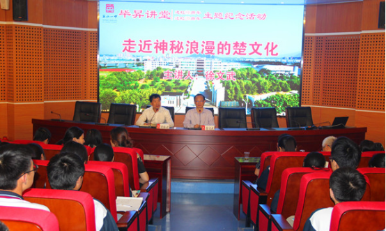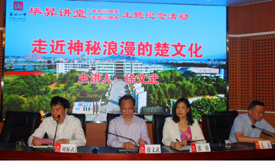 5月5日晚7点,英山一中一楼的报告厅灯火通明、座无虚席。我校文学院教授、硕士生导师、长江大学荆楚文化研究中心主任徐文武以《走近神秘浪漫的楚文化》为题,为英山一中的300余名师生作的精彩的报告。英山一中党委书记、校长刘振武,党委委员、高二年级主任范文,语文和历史学科教师以及高二年级部分学生聆听了讲座。