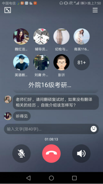 在新冠肺炎防控严峻阶段,随着全国研究生考试初试成绩陆续放榜,在国家线还没有公布的情况下,同学们宅在家中怎么准备复试呢?为了更好地服务考研学子,学院学工办开展了以“考研复试”为主题的学情调查,并于2月28日晚7点在学院考研交流QQ群里举办了语音答疑交流会。会议邀请到研究生导师谈宏慧,谢家成,彭沂,田传茂,陈松松等5位老师为同学们答疑解惑,有85人同时在线参会。