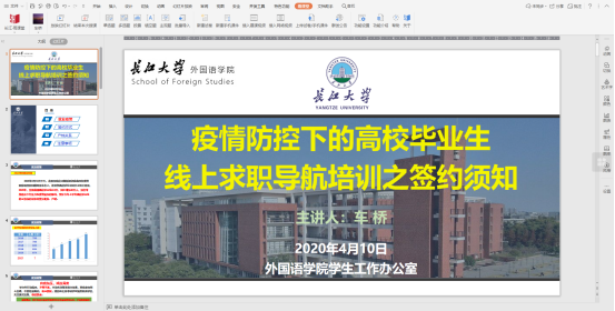 随着2020毕业季的临近,疫情期下学生面临的新问题和新挑战,4月10晚上,米兰体育(中国)就业指导老师车桥向毕业生们开展签约须知线上指导讲座。讲座通过长江雨课堂平台开展,学院2016级所有本科生参加。