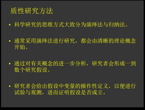 杨教授主要分享以扎根理论研究模式的质性研究方法,首先讲解质性研究方法与量化研究方法的不同思维方式,进而引出质性研究方法的研究要点同时简要介绍质性研究的方法。接着介绍在应用语言学领域中质性研究的基本模式以及资料收集方式。杨教授通过举例来着重讲解扎根理论研究模式的来源,研究思路,资料收集方式,资料分析阶段,资料编码等,并为我们分享了针对扎根理论的相关书籍。然后杨教授分析扎根理论研究模式在质性研究中不同阶段的操作特征,涵盖该研究模式的研究设计的相关步骤,资料收集的相关问题,资料分析阶段涉及的编码问题,以及理论构建的方法。最后,杨教授在扎根理论的检验与应用上,指出该理论的优势与局限性。