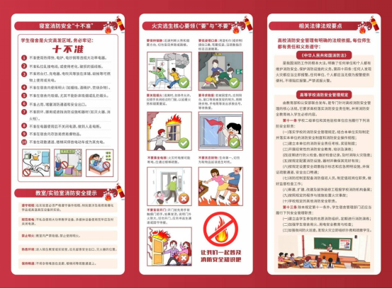 学院精心编印了《消防安全 平安校园》宣传折页,以图文并茂的形式,系统梳理了近三年高校典型火灾案例、宿舍消防注意事项、火场逃生要诀及相关法律法规。手册通过学生组织分发至各班级、各寝室,实现宣传教育全覆盖。