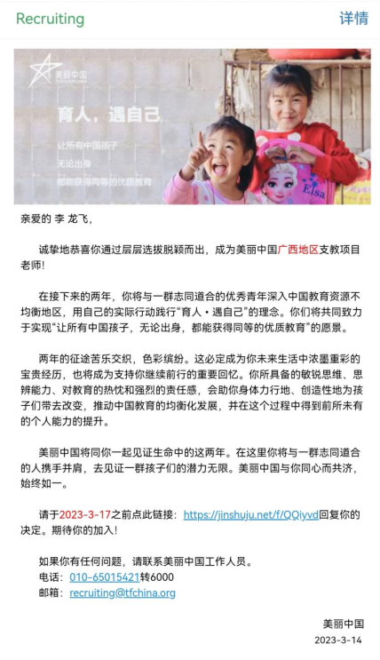 继续追梦,继续攀登,他以奉献社会、志愿服务为自己的人生发展方向,在毕业之际,他毅然报名了美丽中国支教项目,立志继续他的公益之路。他说支教于他而言就是那一句著名的格言:“一棵树摇动另一棵树,一朵云推动另一朵云,一个灵魂唤醒另一个灵魂...”他希望能够用大学四年所学知识去帮助偏远山区的儿童实现他们的梦想,让越来越多的孩子们能够有机会接触到外面的世界,拓展他们的视野。他认为支教不仅仅是教授学科知识,更重要的是传递正能量,引导他们树立正确的人生观和价值观。他希望自己能够成为孩子寻梦路上的一盏小小的明灯,为他们指引前进的方向,让他们学会如何坚强、勇敢地面对生活中的挫折和困难。他深知中国教育的不平等现状,许多贫困地区的孩子们无法享受到优质的教育资源,于是他作为一个有责任感的大学生,希望能够为中国教育均衡化贡献力量。他相信,只要共同努力,中国的教育将会更加平等、优质、均衡,社会也会更加美好、和谐进步。