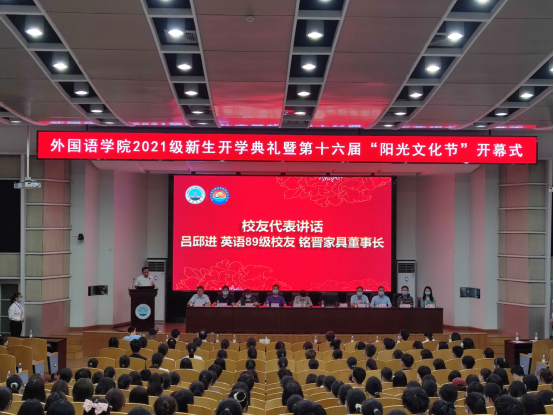 9月22日晚,米兰体育(中国)英语专业89级校友、东莞铭晋家具有限公司董事长吕邱进应邀出席学院2021级新生开学典礼暨第十六届“阳光文化节”开幕式。作为校友代表,他通过自己的求学和创业经历,分享了他的人生感悟,对学弟学妹们提出了希望与期待。