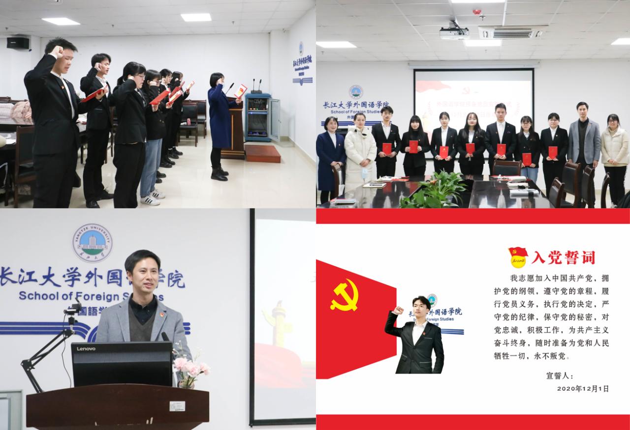 “我志愿加入中国共产党,拥护党的纲领,遵守党的章程……”,新党员面向党旗,举起右挙,在许泽琼老师的领誓下,向党作出庄严承诺。参会的党员老师为新党员发放了党员手册。