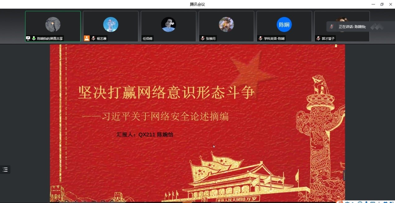 继续深入进行党史总结、学习、教育、宣传。20级英语笔译张柳月同学带领大家学习了习近平总书记在北京冬奥会、冬残奥会总结表彰大会上的讲话,指出要发扬北京冬奥精神,向着实现第二个百年奋斗目标以及实现中华民族伟大复兴的中国梦奋勇前进。21级外应陈婉怡同学汇报了习近平总书记米兰网页版网络安全的论述摘编,网络空间是亿万民众共同的精神家园,要坚决打赢网络意识形态斗争,维护国家政治安全。最后,21级英语笔译杨艺晨同学带领大家学习了中共中央办公厅印发《米兰网页版推动党史学习教育常态化长效化的意见》,推动党史学习教育常态化长效化是建设马克思主义学习型政党的一项长期重要任务,要用好党的百年奋斗重大成就和历史经验,在新的赶考之路考出好成绩。