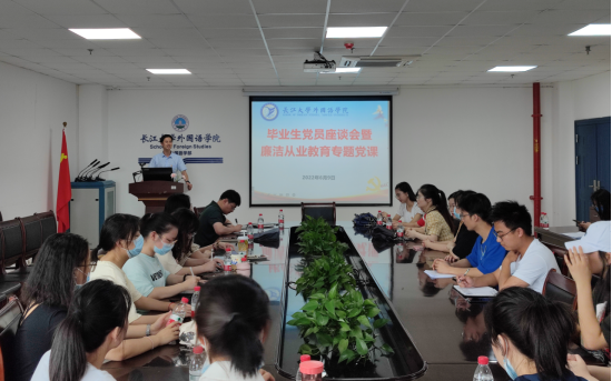 座谈会上,毕业生党员畅所欲言,他们回顾了大学四年的成长历程,分享了自己在学习、工作、生活中的重要时刻以及成长感悟,表达了对母校党组织教育培养的感激之情。英语师范11802班张海洋已入职湖北省京山一中,他表示,要学习在校老师们一丝不苟的教学态度,努力成为一名优秀的人民教师。英语翻译11801班曾晓静表示,踏上工作岗位后将保持终身学习的热情,勤奋努力扎实工作,将来报效社会。商英11805班彭雨嫣考取北京师范大学研究生,她表示,大学四年成长收获颇多,也见证了母校的发展,将来要为学校争光添彩。