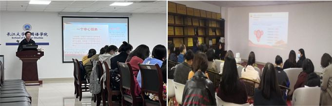 11月24日下午,院长谈宏慧为英语系和商务英语系教师宣讲党的二十大精神,她从“新时代的伟大变革、马克思主义中国化时代化的新境界、以中国式现代化全面推进中华民族伟大复兴、全面建设社会主义现代化国家的战略部署、新时代党的建设新的伟大工程”等五个方面对党的二十大精神进行了系统解读