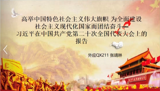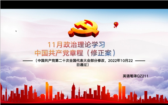 会上,外国语言学及应用语言学21级研究生张靖琳带领大学学习了习近平总书记在中国共产党第二十次全国代表大会上的报告;英语笔译21级研究生吴珺汇报了学习《中国共产党章程(修正案)》的体会,让大家进一步了解了党章的制定及其修订过程;学科英语22级研究生程丰娟带领大家学习了十九届中央纪律检查委员会向中国共产党第二十次全国代表大会的工作报告,强调党员要严格遵守党的纪律和党章,坚持以身作则;英语笔译22级研究生焦倩倩带领大家学习了习近平总书记在党的二十大闭幕会上的重要讲话精神,倡议大家认真学习领会习近平总书记的讲话精神,为实现中华民族伟大复兴中国梦而不懈奋斗。学科英语21级研究生冷依萍传达了《中共中央米兰网页版认真学习宣传贯彻党的二十大精神的决定》文件。