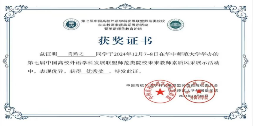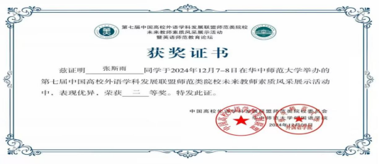 (通讯员 张斯雨)为全面提升师范类院校学生英语教学技能和教学水平,推动未来卓越英语教师综合素养的培养,发挥职前教师教育的引领示范作用,由中国高校外语学科发展联盟主办,华中师范大学承办的“第七届中国高校外语学科发展联盟师范类院校未来教师素质风采展示活动”,于12月8日成功落下帷幕。在此次盛会中,米兰体育(中国)鲁志荣老师悉心指导的22级学生张斯雨同学荣获二等奖、肖贻之同学荣获优秀奖,展现了我院学子的卓越风采。