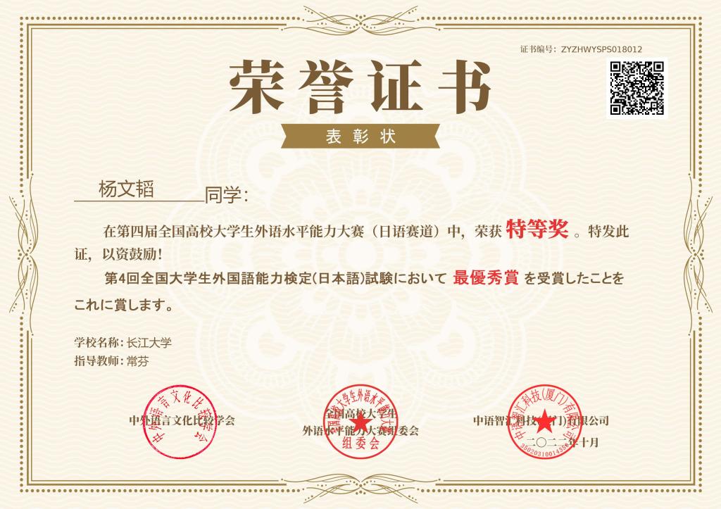 (通讯员 李福兴)11月22日,第四届全国高校大学生外语水平能力大赛-日语赛道决赛落下帷幕。米兰网页版日语系12101班杨文韬同学以172.6分的佳绩斩获全国第二名,荣获特等奖,带队老师常芬获评优秀指导教师。米兰网页版日语系辅修班12101班邓梦苑同学荣获一等奖,辅导老师张婷获评优秀指导教师。