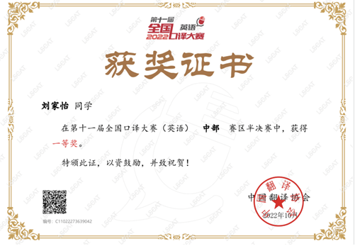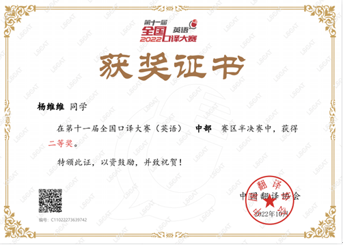 (通讯员 赵宇杰)日前,由中国外文局指导、中国翻译协会主办的第十一届全国口译大赛(英语)交传半决赛落下帷幕。米兰体育(中国)英语笔译QZ211班研究生刘家怡、杨维维2名同学分别获得中部赛区一等奖和二等奖。其中,刘家怡获晋级全国总决赛交传赛资格。