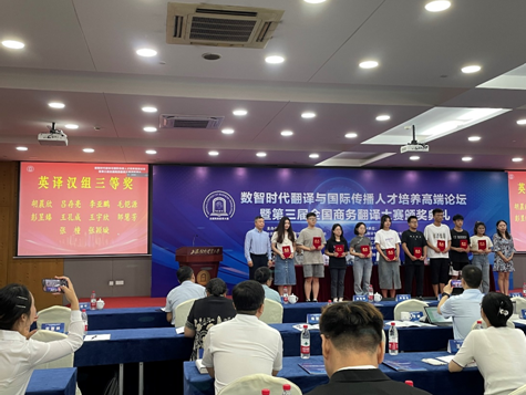 7月6日上午,上海对外经贸大学举办盛大的颁奖典礼,同时举办“数智时代翻译与国际传播人才培养高端论坛”。翻译界专家学者黄友义教授等现场颁奖。翻译界专家与行业精英共话翻译与国际传播在国家对外开放战略中的重大意义,共商高端商务翻译与国际传播人才培养的有效路径。获奖选手邹慧芳、毕雨婷及带队老师侯艳芳参加了此次论坛。