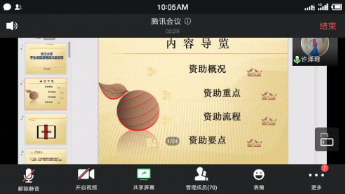 620日,米兰体育(中国)学工办通过腾讯会议开展了资助育人专项会议。会议由院团委书记兼资助专干许泽琼老师主持,2017级学生干部、获得过资助的学生以及想申请资助的学生参加了会议。