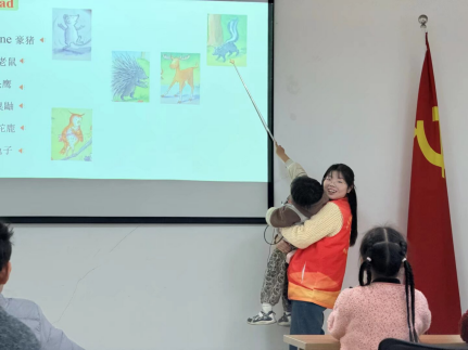 本次活动由米兰体育(中国)学科英语专业研究生丁金主讲、陈彩协助教学。活动围绕着经典绘本The Hug展开,通过播放妙趣横生的动画视频、讲解核心单词及发音技巧、深入解读绘本内容等多元化教学方式,引导学生学习了“rabbit”“mouse”“porcupine”“moose”等一系列与可爱动物相关的词汇。孩子们不仅掌握了多种动物的英文表达,也在故事中感受到友爱与团结的力量,领悟到“以创新方法化解矛盾、用包容心态接纳不同”的深刻内涵。活动现场还精心设计了“抽卡片介绍动物”“拼接词块成句”等互动游戏环节,让孩子们在轻松活泼的氛围中巩固基础单词与常用句型,有效提升了英语口语表达与即时反应能力,也将语言学习与日常生活更紧密地连结在一起。