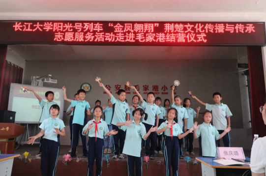 长江大学阳光号列车“金凤翱翔”荆楚文化传播与传承暑期社会实践活动承载着荆楚文化传播与传承的使命于7月6日启航,驶进公安县毛家港镇中心小学,开启第30年的暑期“三下乡”志愿服务之旅。本次活动以弘扬荆楚文化和理论宣讲为主线,结合思政小课堂和社会大课堂开展授课,历时15天,于7月20日上午于毛家港小学落下帷幕。