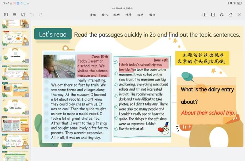 郑雨佳同学的磨课内容为七年级下册人教版Unit 11 How was your school trip?中的2a-2c部分,课型为阅读课。导入阶段,郑雨佳同学以紧贴学生实际生活情境的方式,激发同学对教学内容相关话题的自觉联想(对最近一次旅行的回忆和描述)。以关键词提示和支架式教学的方式,为学生提供了具有结构性和逻辑性的思维方式,并于其中穿插对重点词汇的渗透和讲解,为学生在接下来的课程学习过程中打下良好基础和铺垫。而在课文内容的具体讲解过程中,又采用了诸如小组展示等多元化的教学方式,通过表格和思维导图等教学形式辅助学生对教学内容进行更为深刻和透彻的理解与学习。