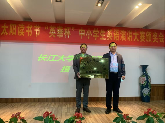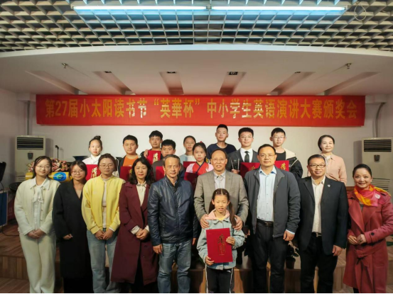 (通讯员 王娟)11月9日下午,荆州英华书院举办“第27届小太阳读书节‘英华杯’中小学英语演讲大赛颁奖会”。我院党委书记周杰、英语系主任王娟及卓越师范班的余桦、杜蓉、罗彤学生受邀参会。荆州市图书馆副馆长汤军、荆州英华书院校长王景辉等领导及家长、学生代表也参与了此次盛会。